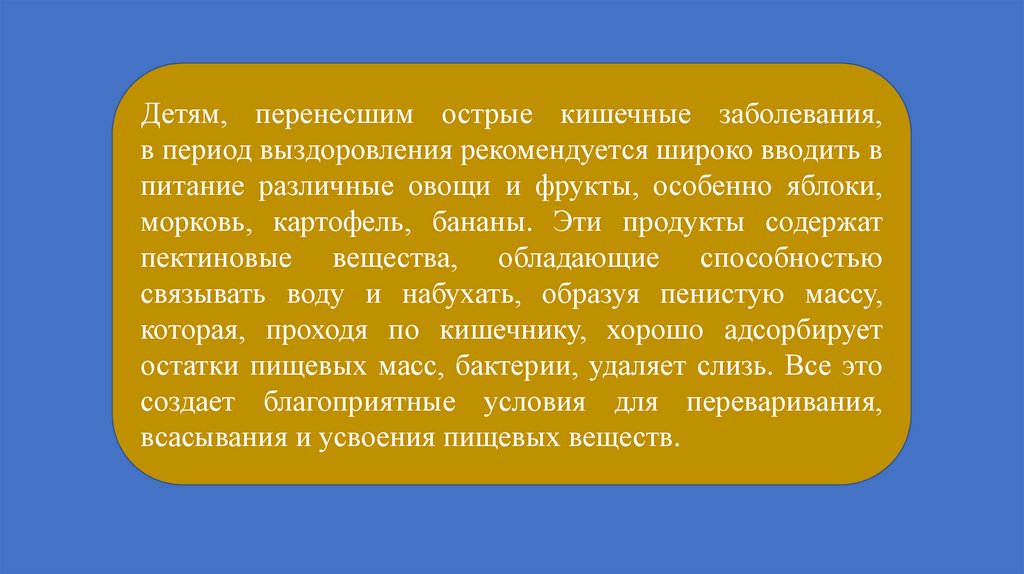 Детям, перенесшим острые кишечные заболевания,в период выздоровления рекомендуется широко вводить в