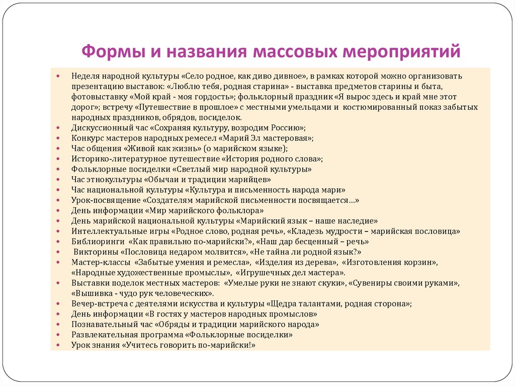 Формы и названия массовых мероприятийНеделя народной культуры «Село родное, как диво дивное», в рамках которой можно организовать