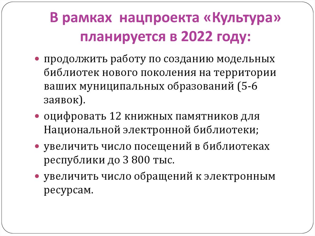В рамках нацпроекта «Культура»планируется в 2022 году: