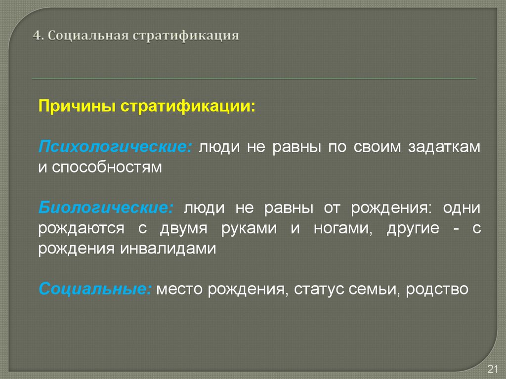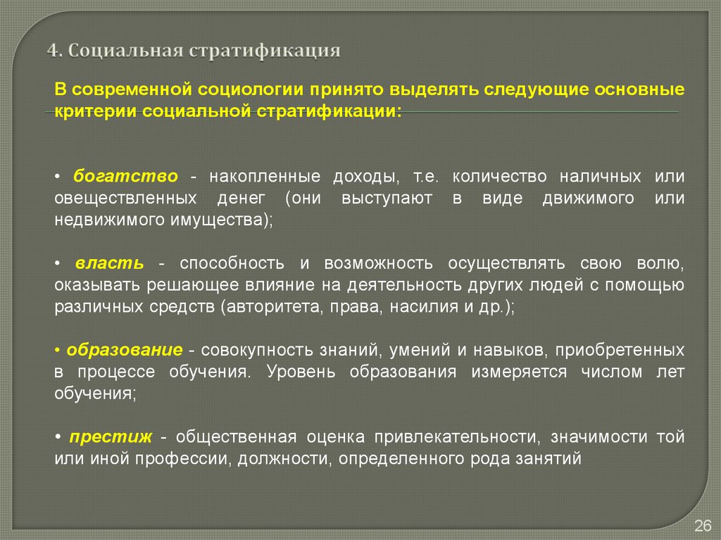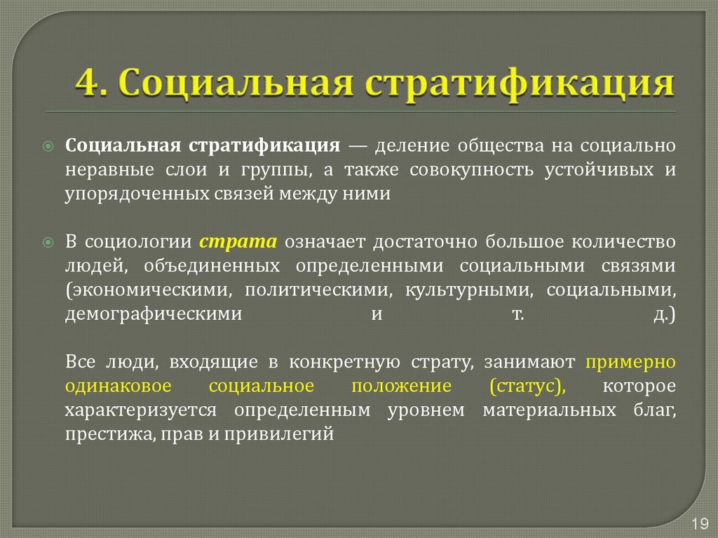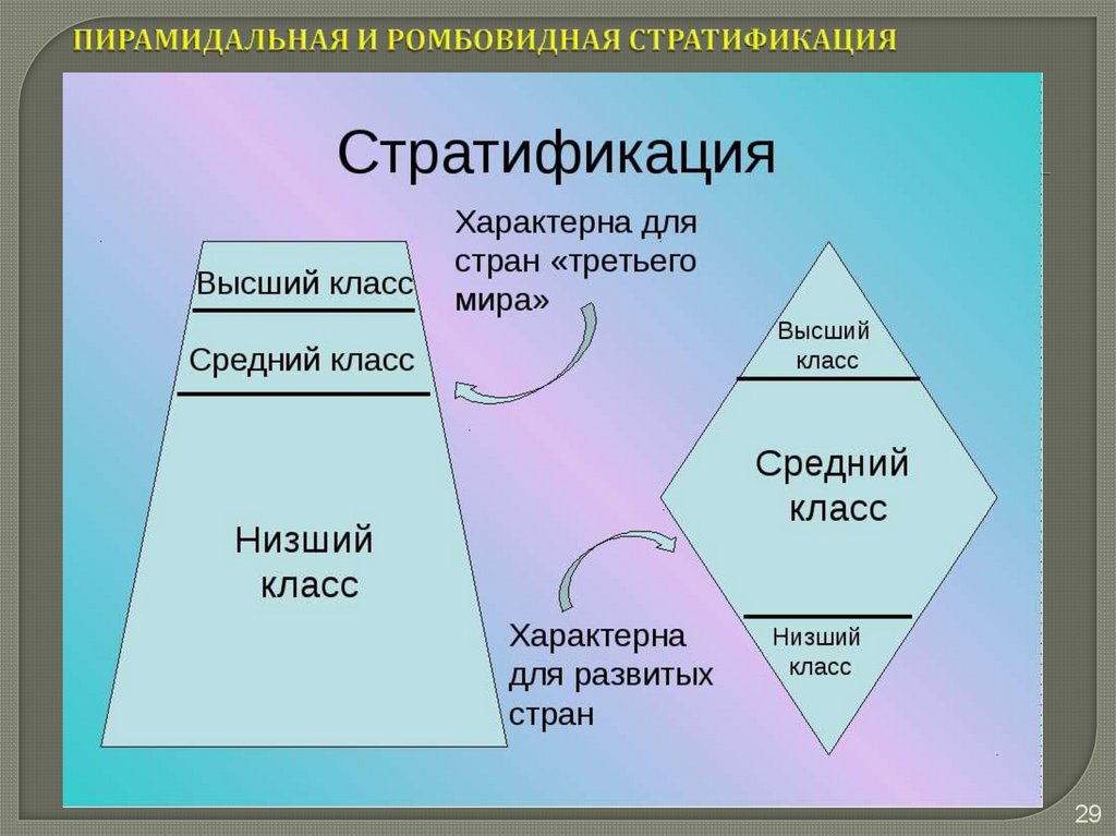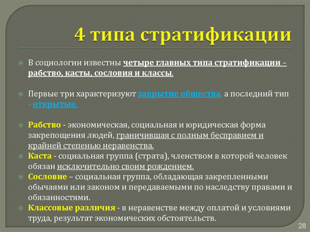 В социологии известны четыре главных типа стратификации –рабство, касты, сословия и классы.