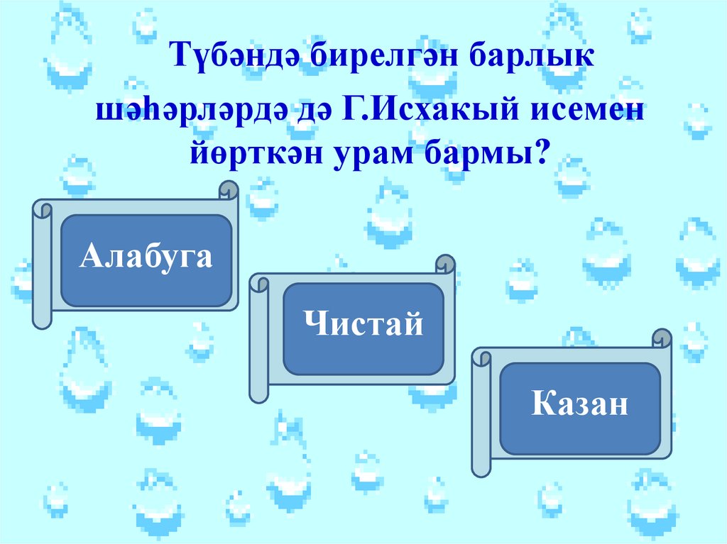 Түбәндә бирелгән барлыкшәһәрләрдә дә Г.Исхакый исемен