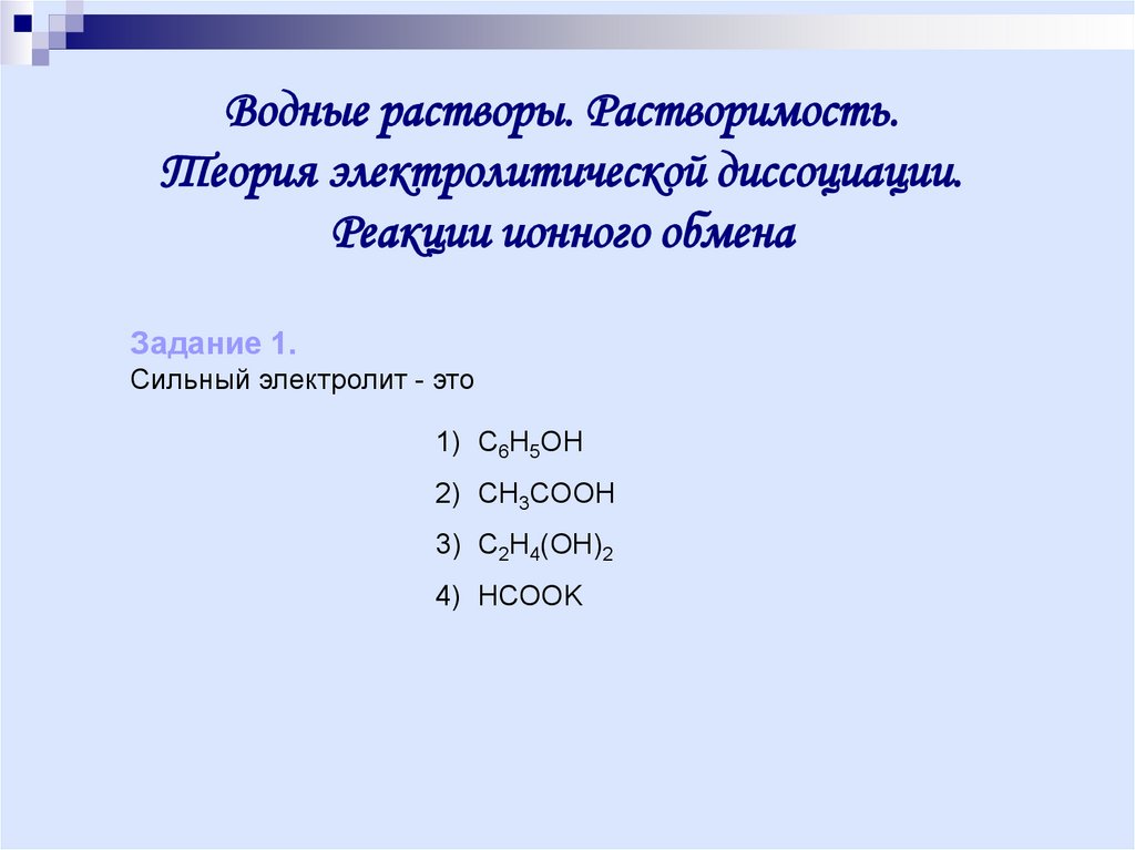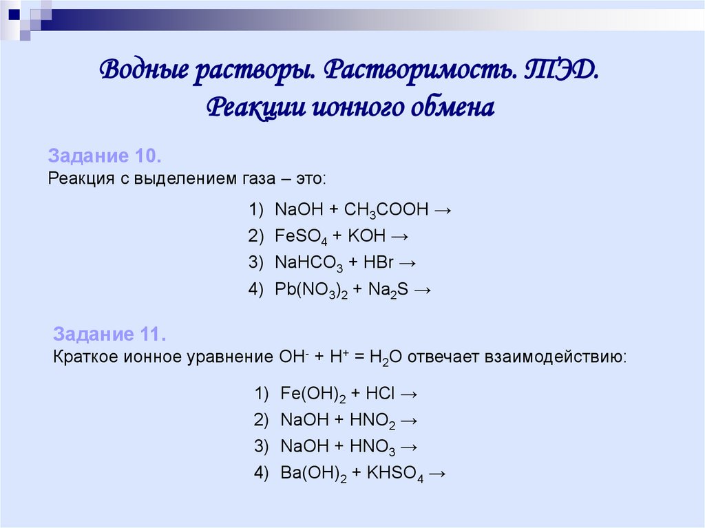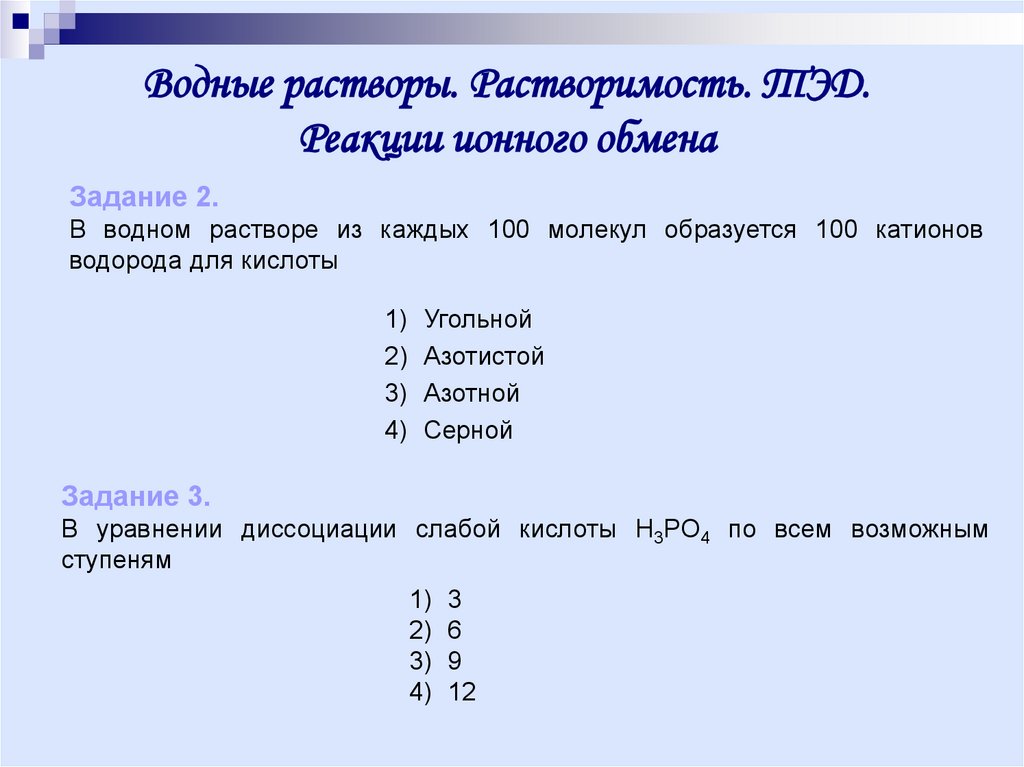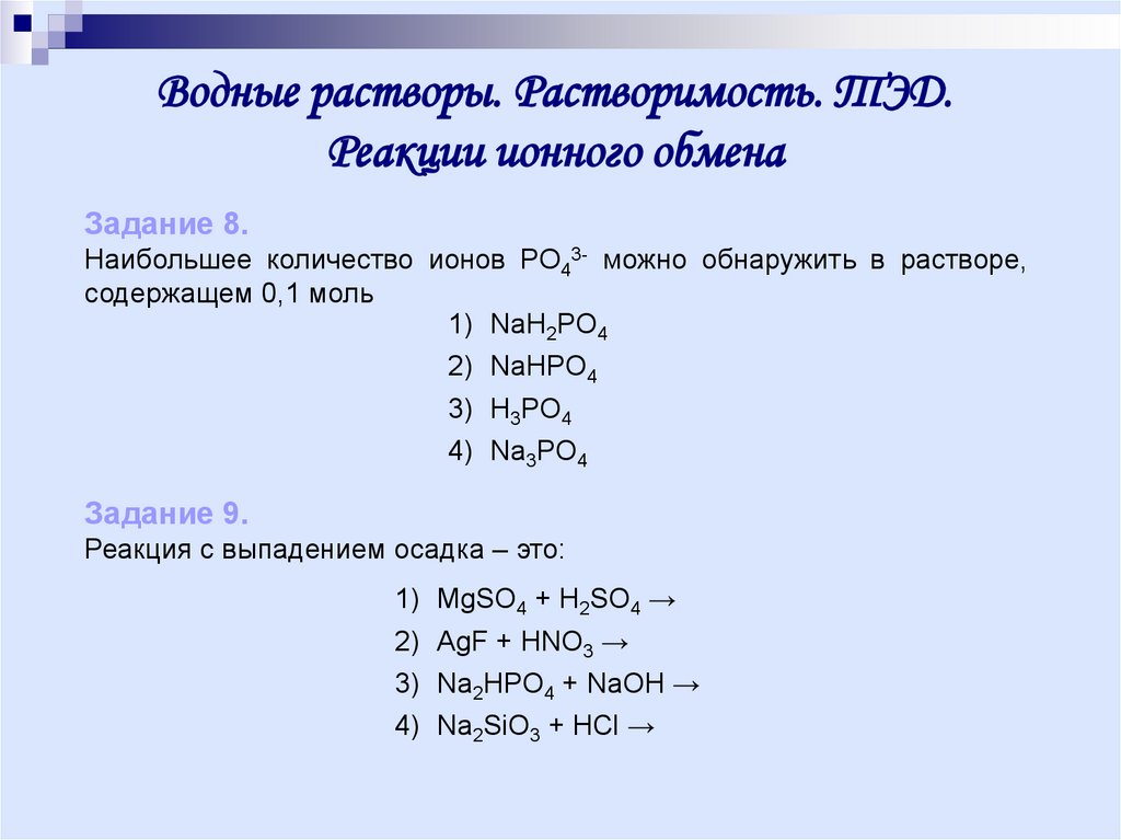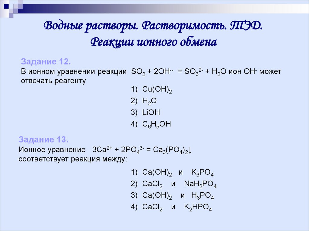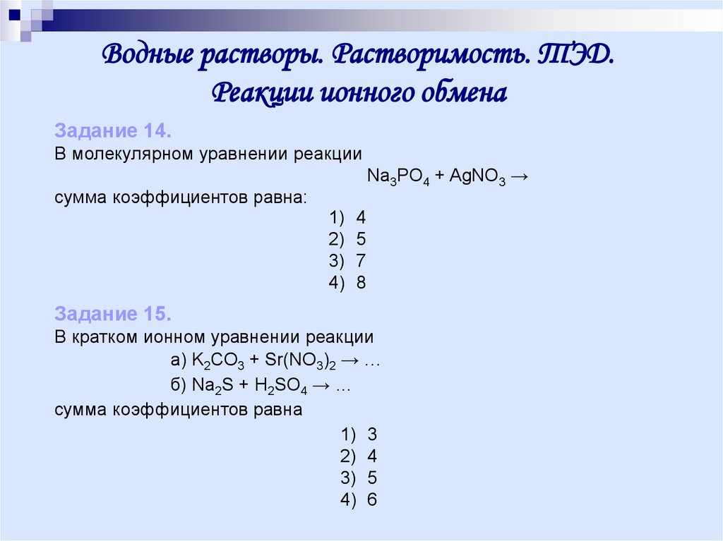 Водные растворы. Растворимость. ТЭД.Реакции ионного обмена