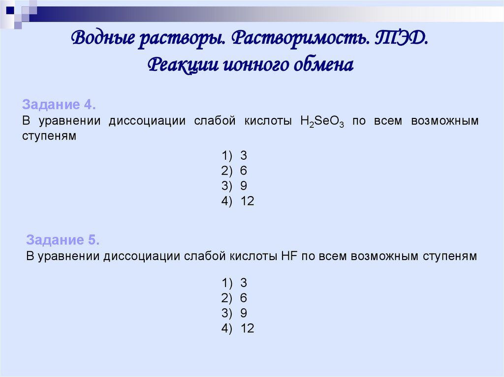 В уравнении диссоциации слабой кислоты H2SeO3 по всем возможным