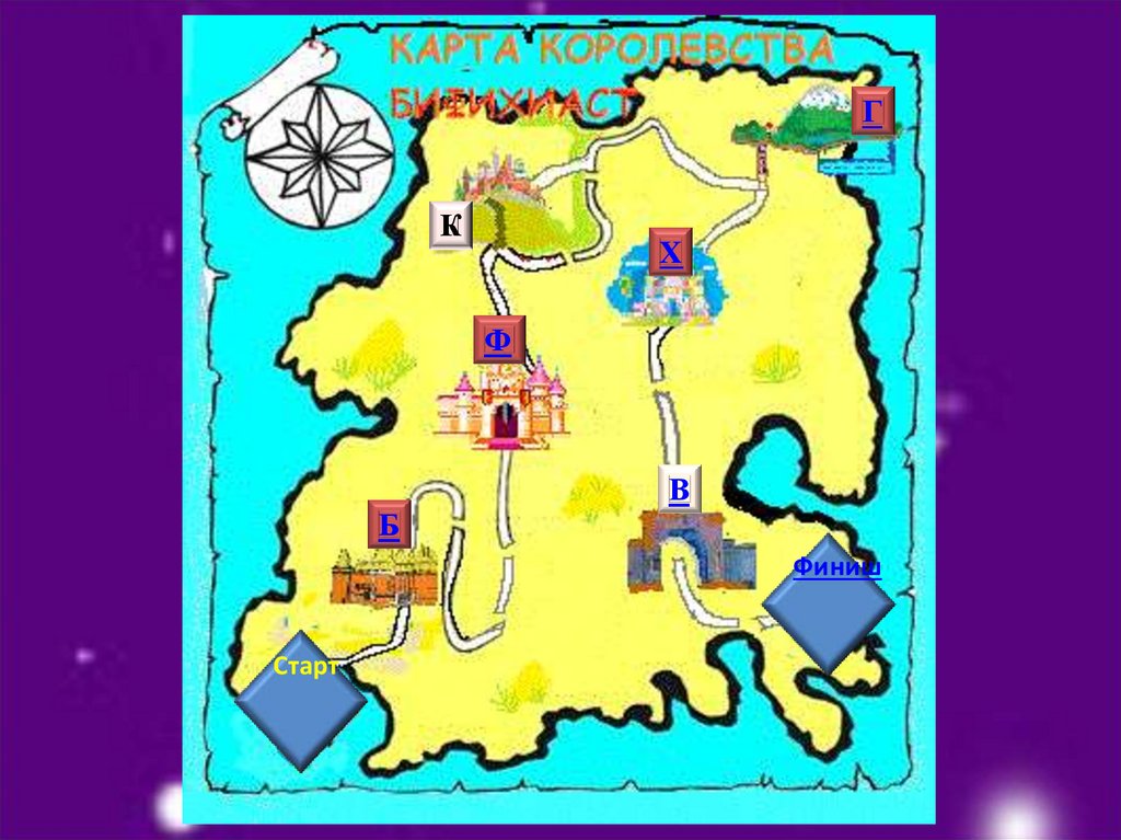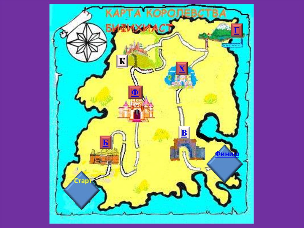 • В этом королевстве вы посетите: «Физград» (Ф), «Химград»(Х), «Географическая гора» (Г), «Биоград» (Б), где команда