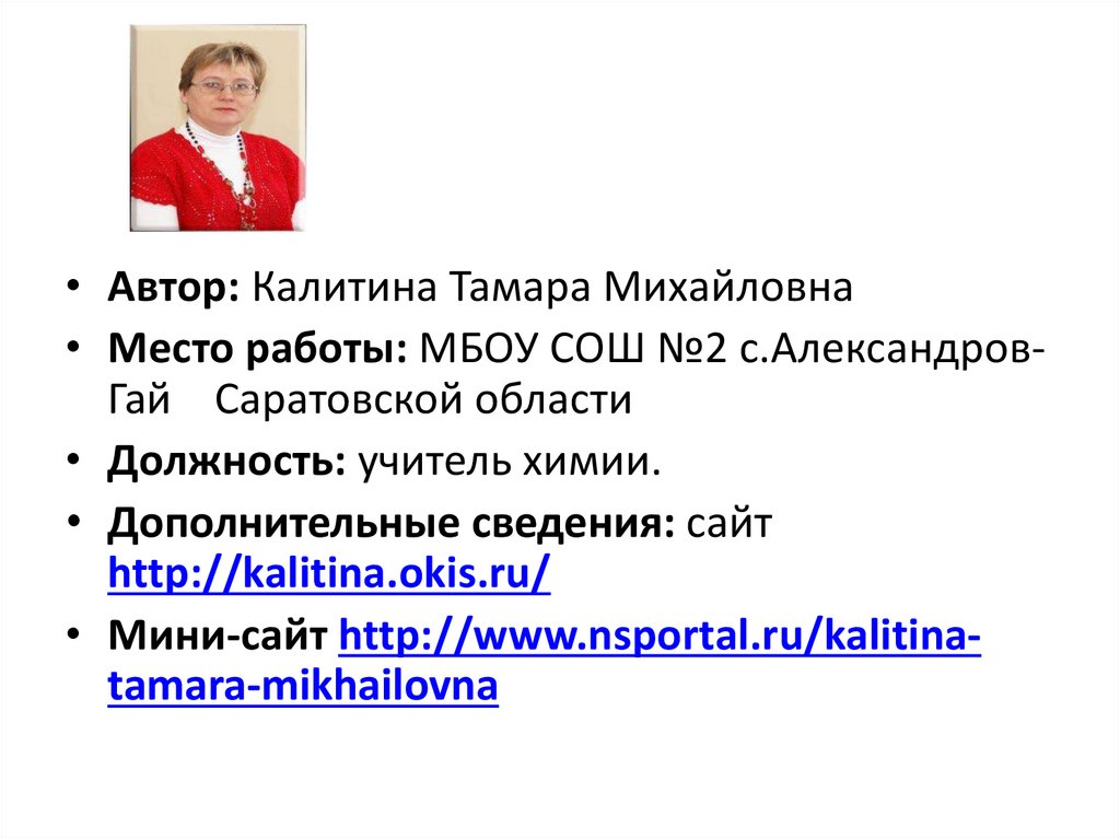 • Автор: Калитина Тамара Михайловна• Место работы: МБОУ СОШ №2 с.АлександровГай Саратовской области