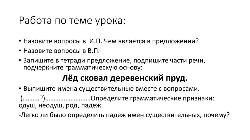 Работа по теме урока:• Назовите вопросы в И.П. Чем является в предложении?