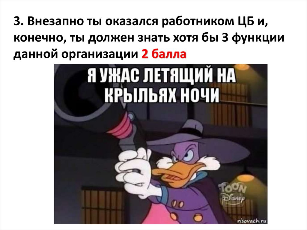 3. Внезапно ты оказался работником ЦБ и,конечно, ты должен знать хотя бы 3 функции