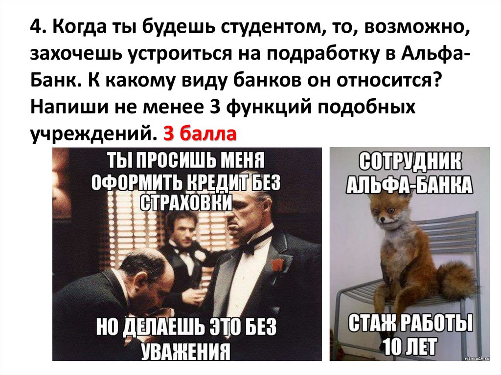 4. Когда ты будешь студентом, то, возможно,захочешь устроиться на подработку в АльфаБанк. К какому виду банков он относится?