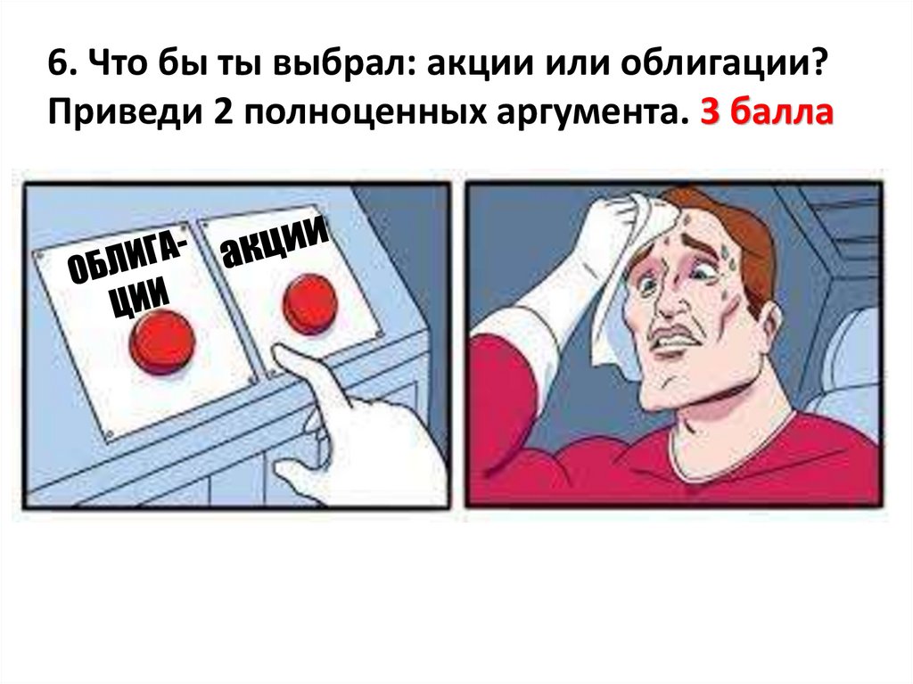 6. Что бы ты выбрал: акции или облигации?Приведи 2 полноценных аргумента. 3 балла