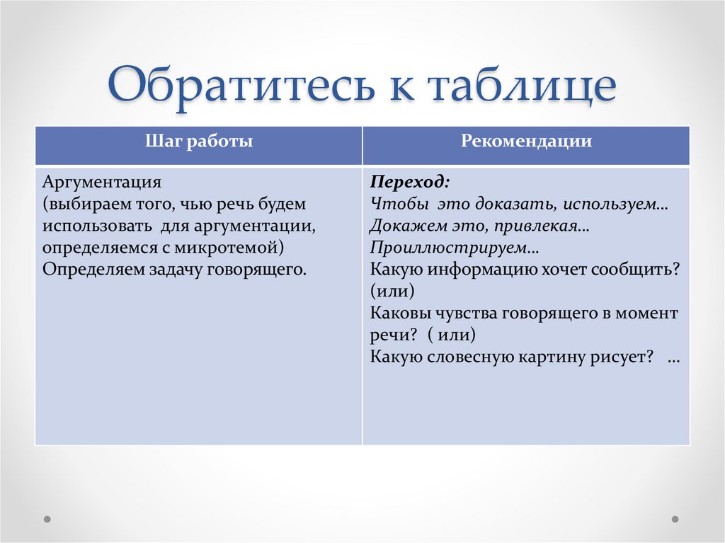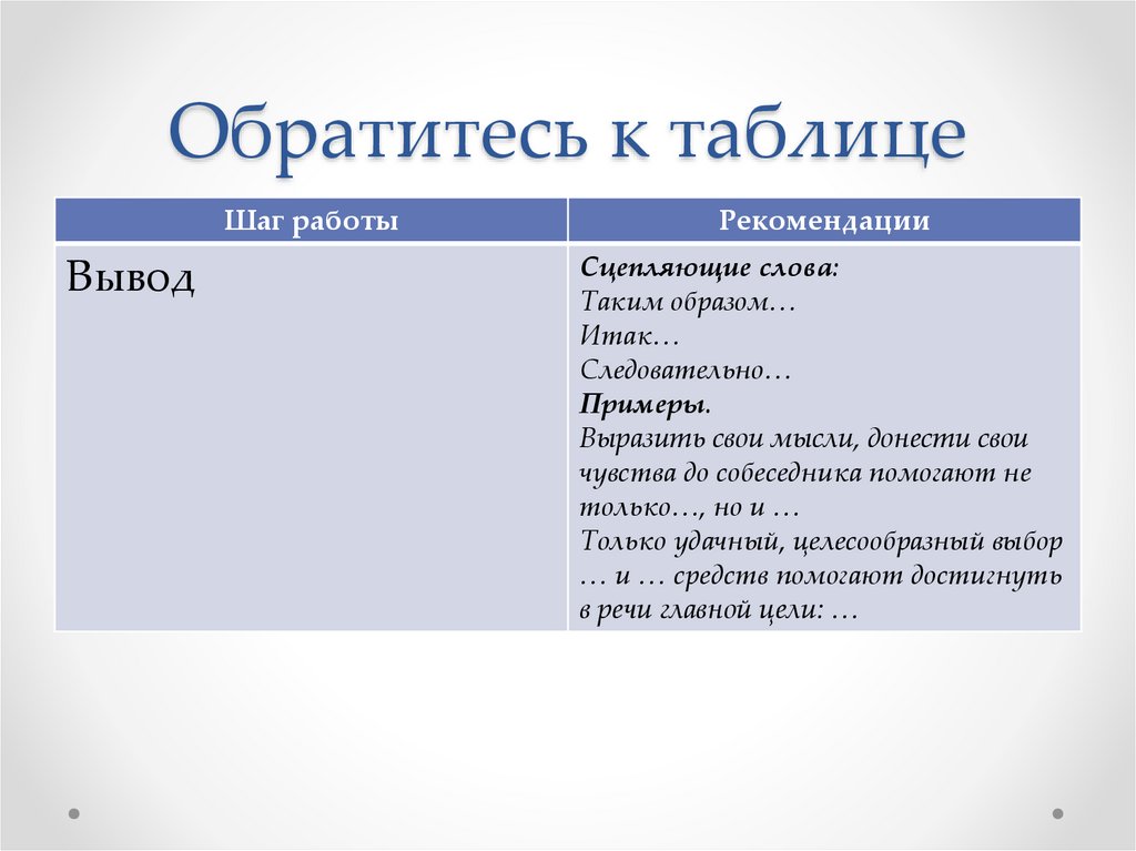Обратитесь к таблицеШаг работы