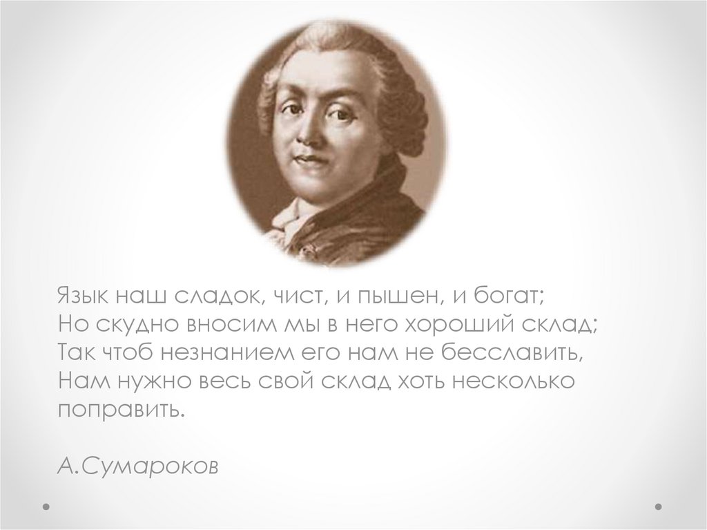 Язык наш сладок, чист, и пышен, и богат;Но скудно вносим мы в него хороший склад;