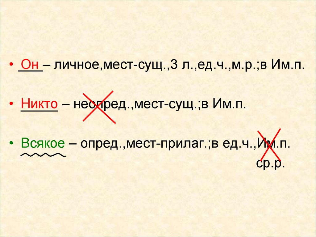 • Он – личное,мест-сущ.,3 л.,ед.ч.,м.р.;в Им.п.• Никто – неопред.,мест-сущ.;в Им.п.