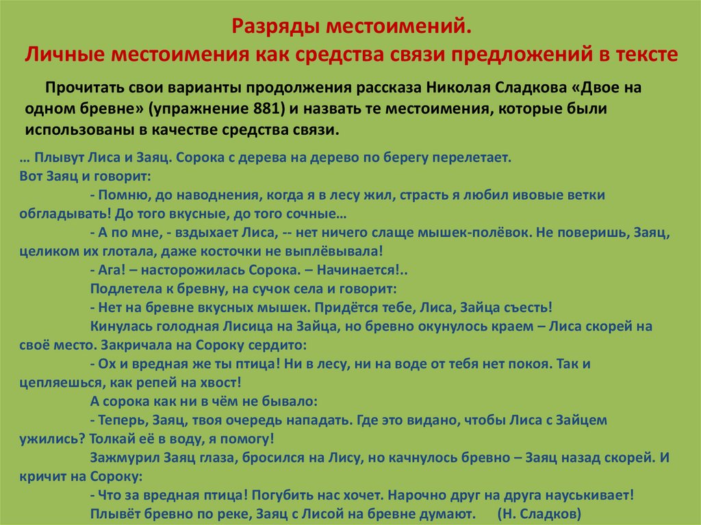 одном бревне» (упражнение 881) и назвать те местоимения, которые были