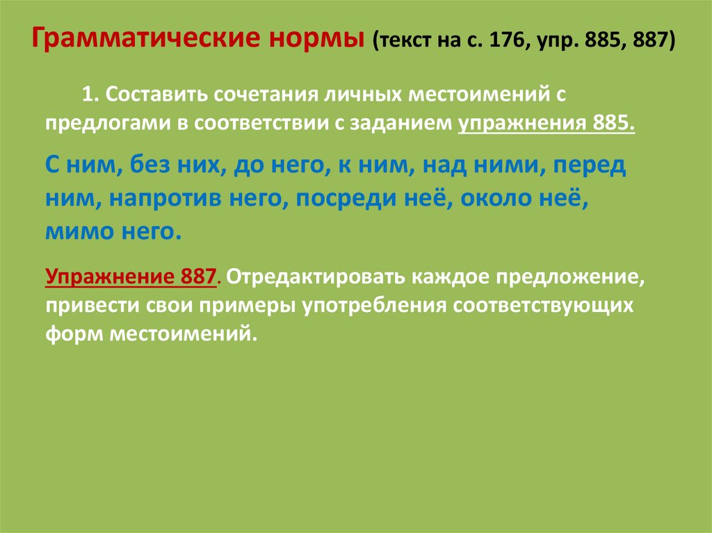 Грамматические нормы (текст на с. 176, упр. 885, 887)1. Составить сочетания личных местоимений с