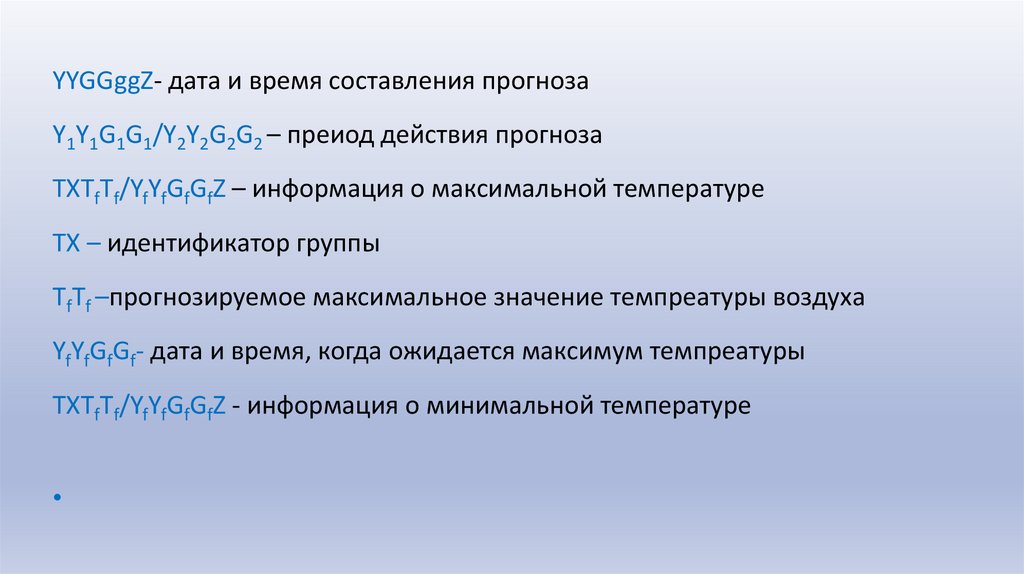 YYGGggZ- дата и время составления прогнозаY1Y1G1G1/Y2Y2G2G2 – преиод действия прогноза