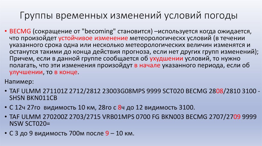 Группы временных изменений условий погоды• BECMG (сокращение от "becoming" становится) –используется когда ожидается,