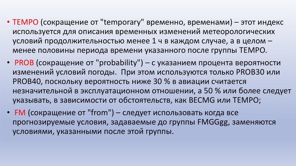 • TEMPO (сокращение от "temporary" временно, временами) – этот индексиспользуется для описания временных изменений метеорологических