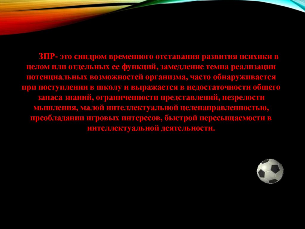 ЗПР- это синдром временного отставания развития психики вцелом или отдельных ее функций, замедление темпа реализации