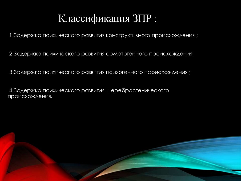 Классификация ЗПР :1.Задержка психического развития конструктивного происхождения ;