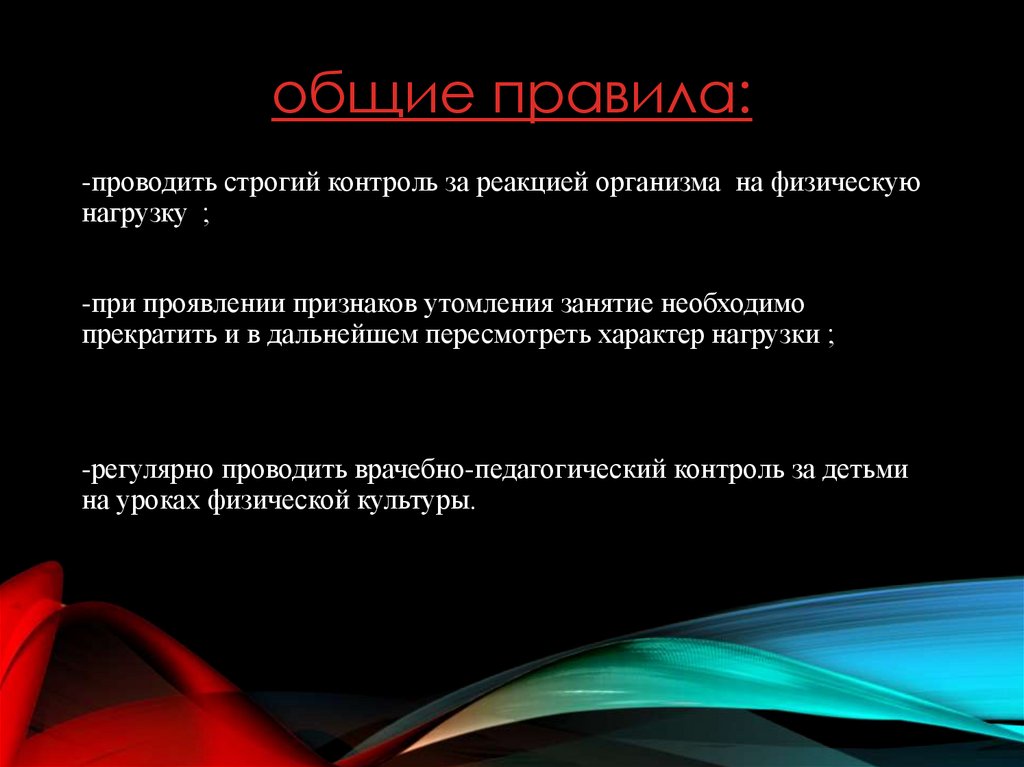 общие правила:-проводить строгий контроль за реакцией организма на физическую
