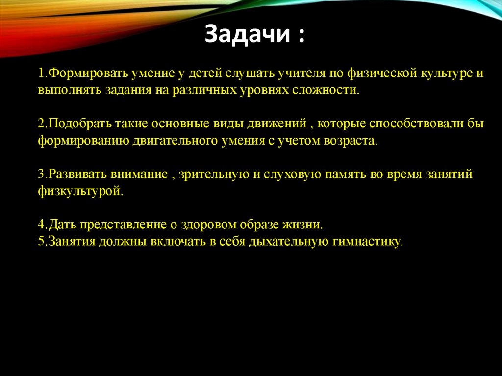 Задачи :1.Формировать умение у детей слушать учителя по физической культуре и