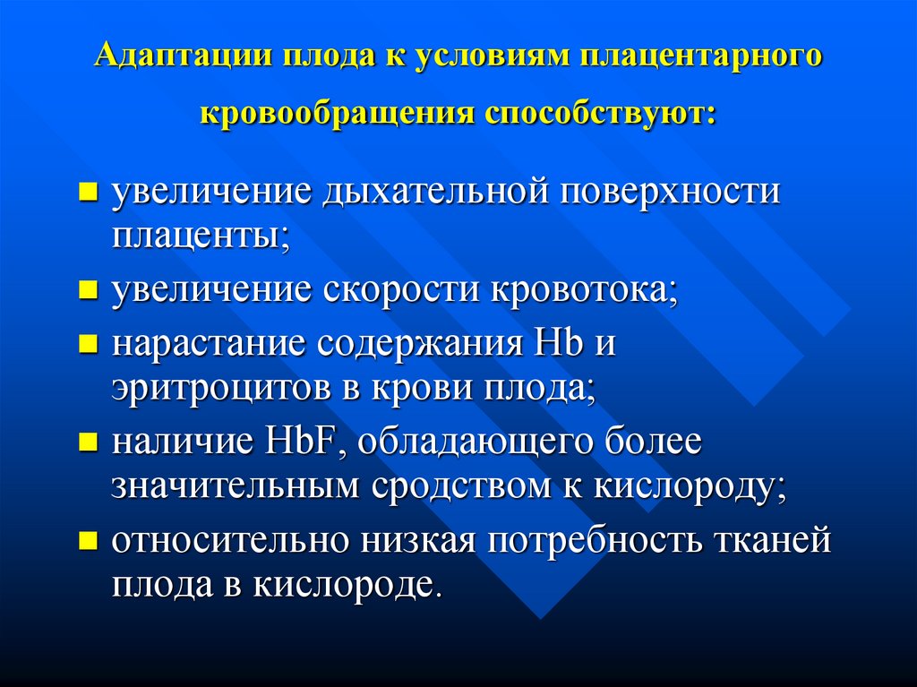 Адаптации плода к условиям плацентарногокровообращения способствуют: