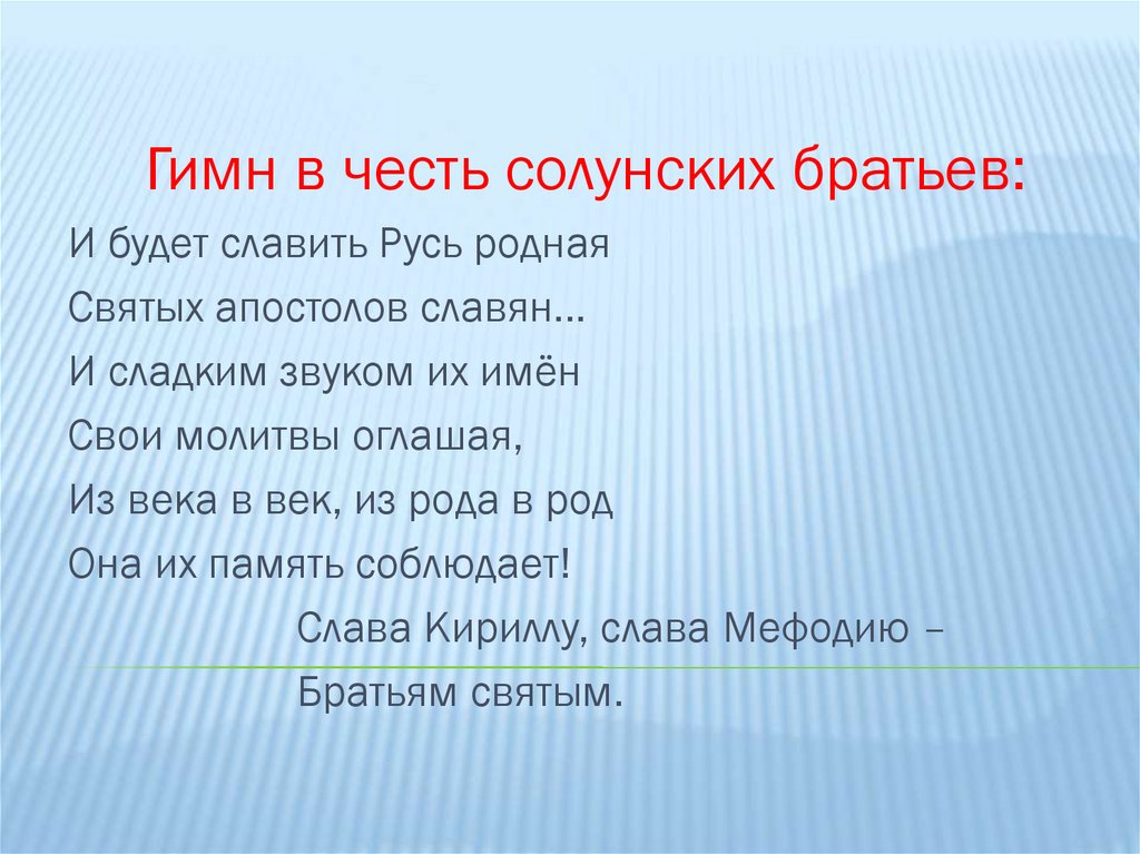 Гимн в честь солунских братьев:И будет славить Русь родная