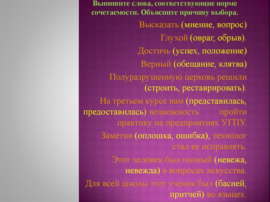 Выпишите слова, соответствующие нормесочетаемости. Объясните причину выбора.