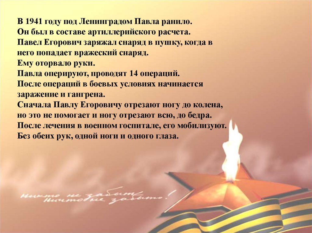 В 1941 году под Ленинградом Павла ранило.Он был в составе артиллерийского расчета.