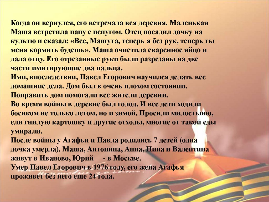 Умер Павел Егорович в 1976 году, его жена Агафья