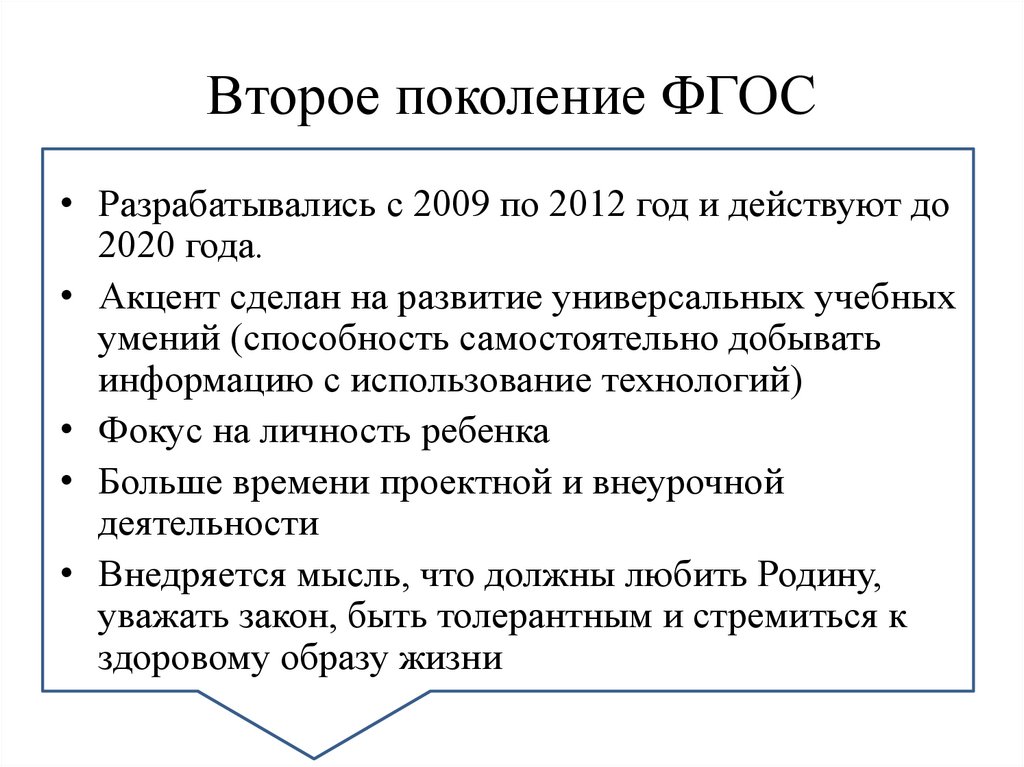 Второе поколение ФГОС• Разрабатывались с 2009 по 2012 год и действуют до