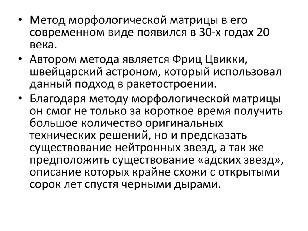• Метод морфологической матрицы в егосовременном виде появился в 30-х годах 20