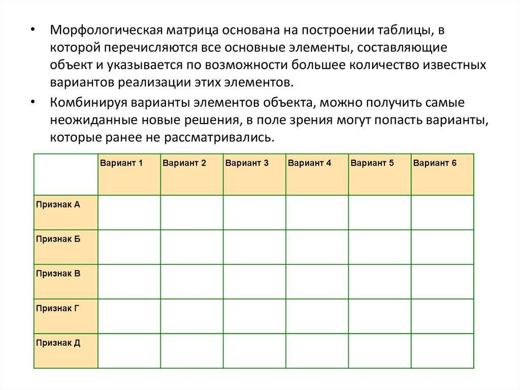 • Морфологическая матрица основана на построении таблицы, вкоторой перечисляются все основные элементы, составляющие