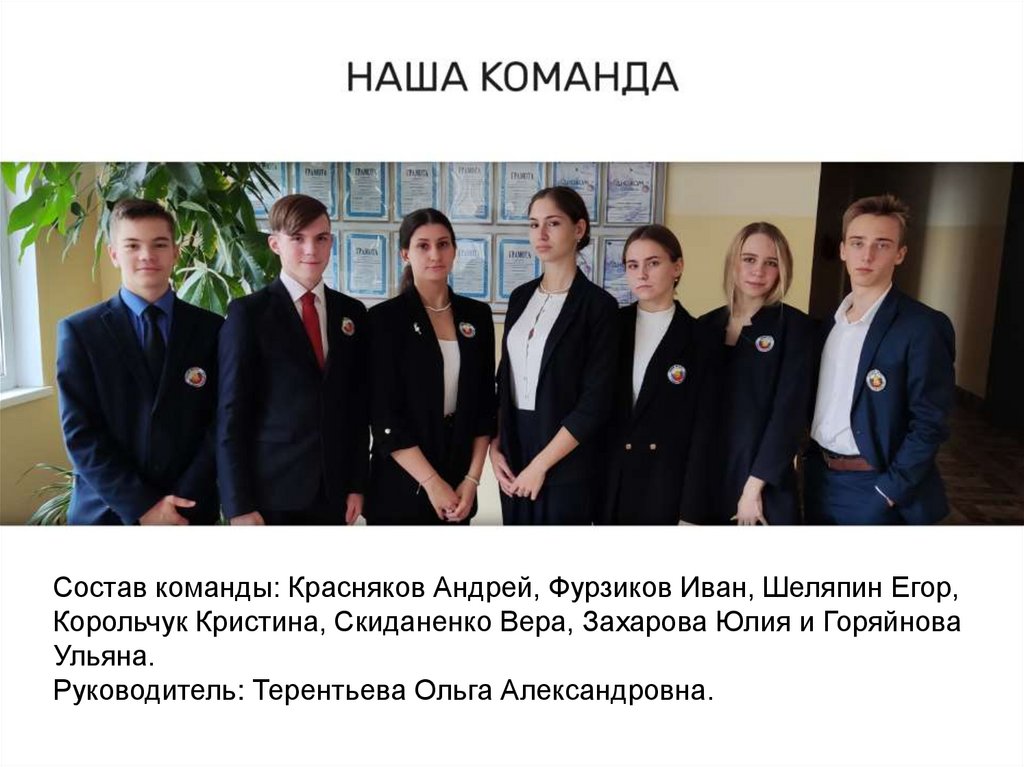 Состав команды: Красняков Андрей, Фурзиков Иван, Шеляпин Егор,Корольчук Кристина, Скиданенко Вера, Захарова Юлия и Горяйнова