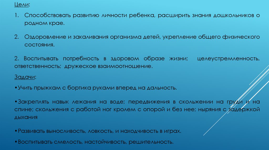 •Закреплять навык лежания на воде; передвижения в скольжении на груди и на