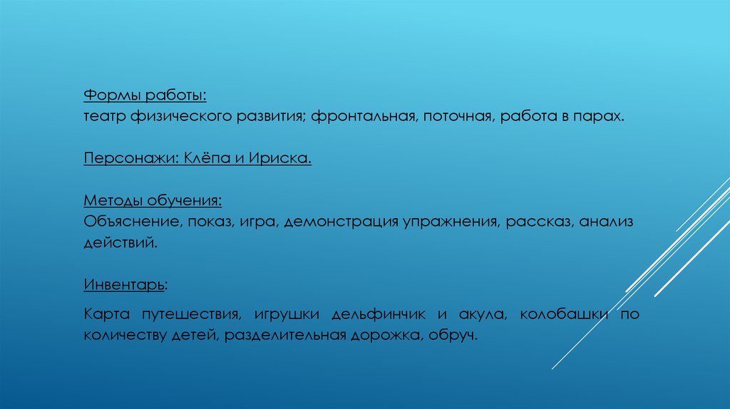 Формы работы:театр физического развития; фронтальная, поточная, работа в парах.