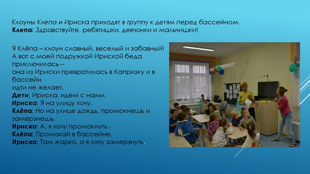 Клоуны Клепа и Ириска приходят в группу к детям перед бассейном.Клепа: Здравствуйте, ребятишки, девчонки и мальчишки!