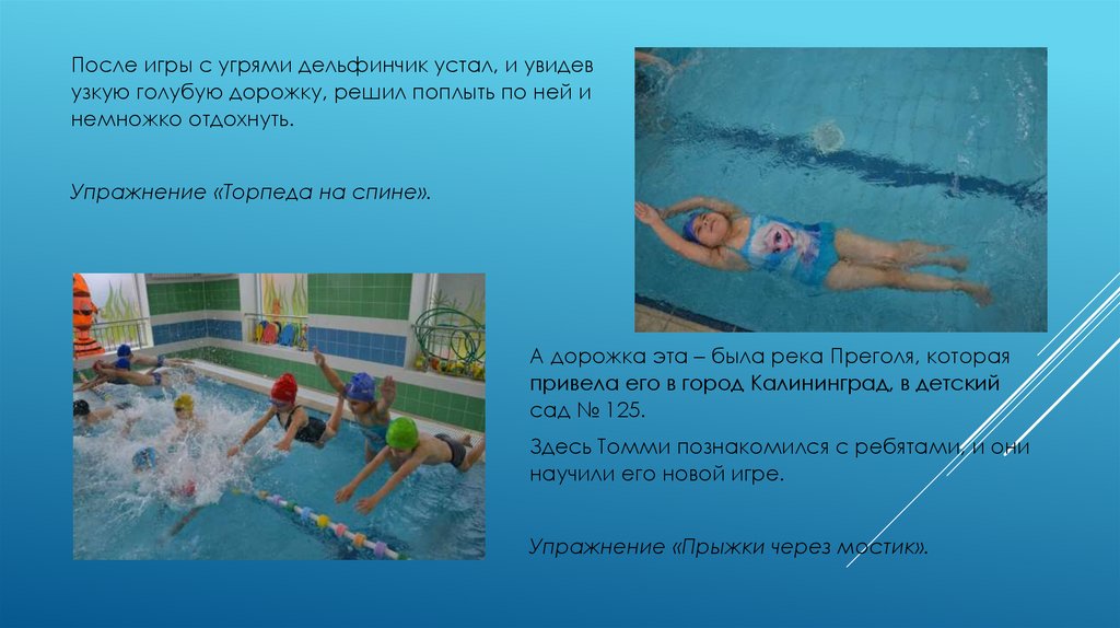 После игры с угрями дельфинчик устал, и увидевузкую голубую дорожку, решил поплыть по ней и