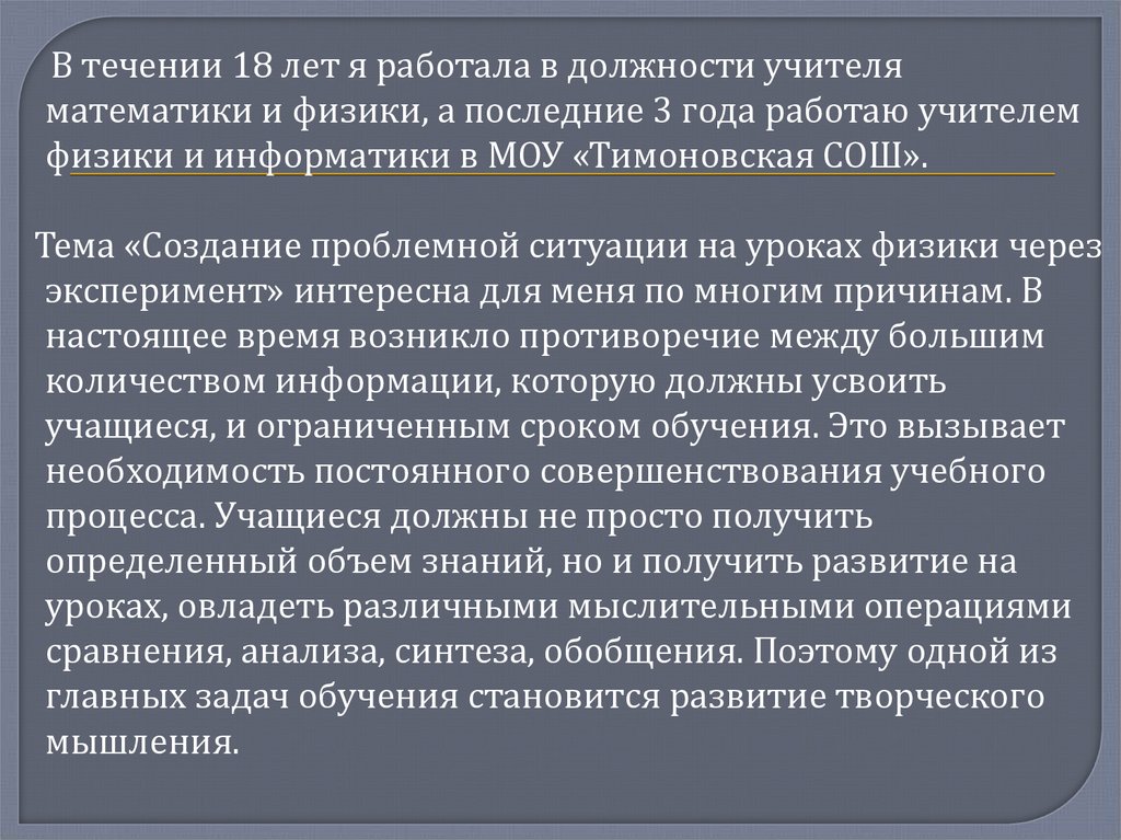 В течении 18 лет я работала в должности учителяматематики и физики, а последние 3 года работаю учителем