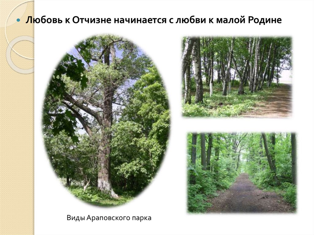 Любовь к Отчизне начинается с любви к малой РодинеВиды Араповского парка