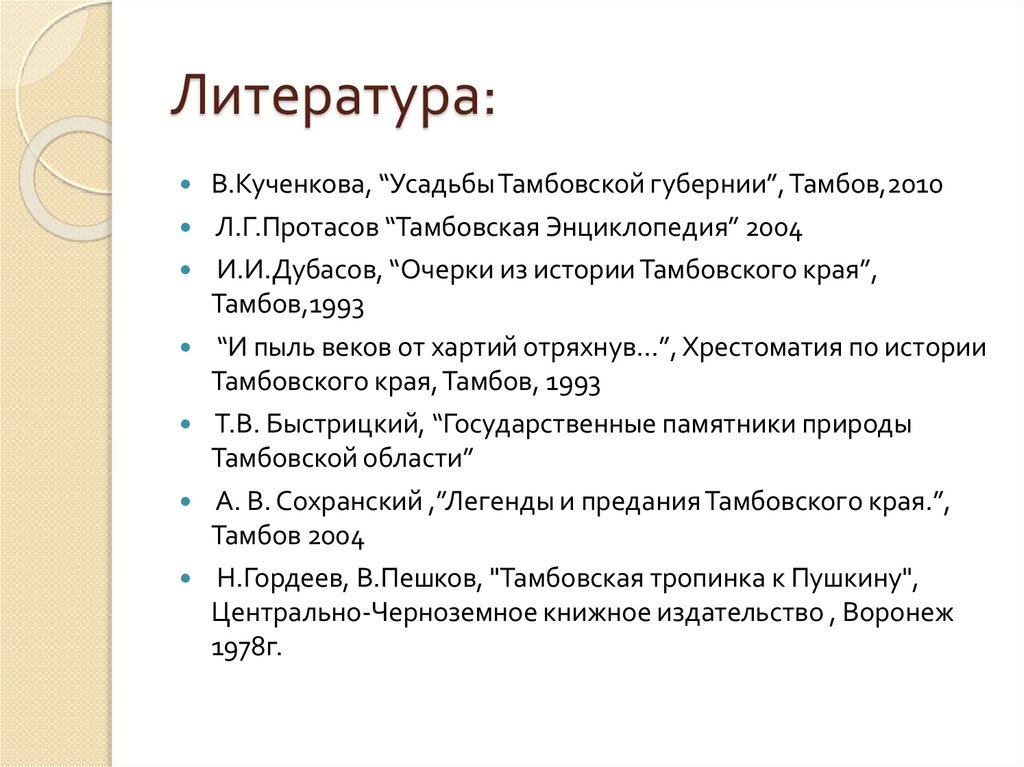 Литература:В.Кученкова, “Усадьбы Тамбовской губернии”, Тамбов,2010