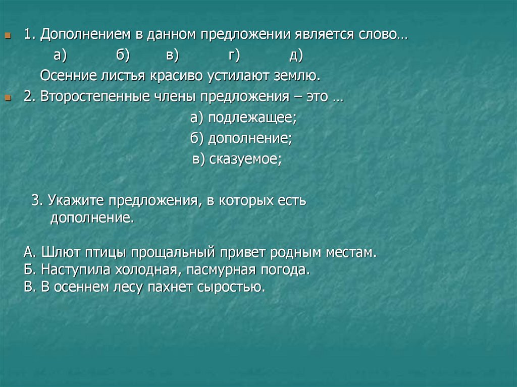 9. Дополнение – второстепенный член предложения, который отвечает на вопросы косвенных падежей и обозначает предмет. Дополнения