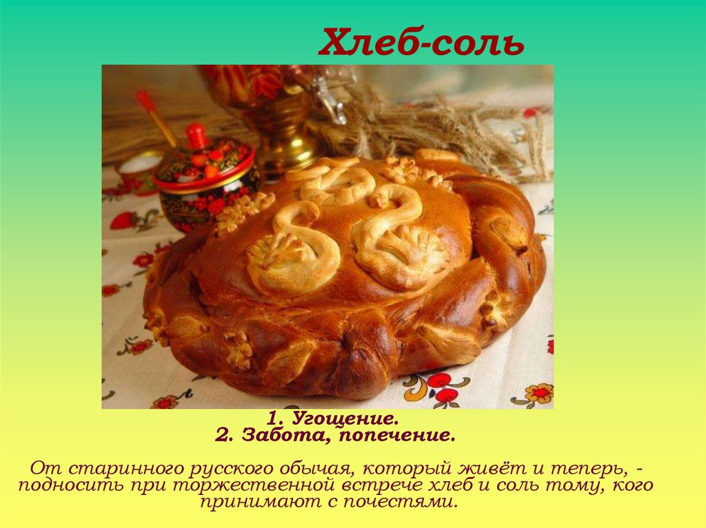 От старинного русского обычая, который живёт и теперь, подносить при торжественной встрече хлеб и соль тому, кого