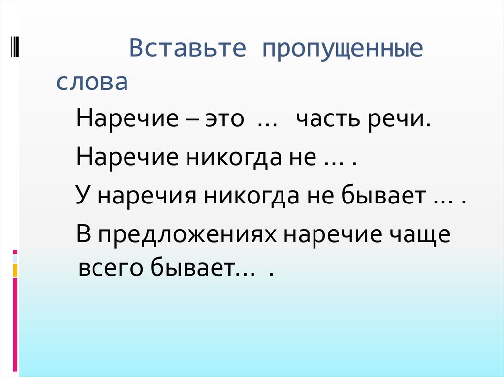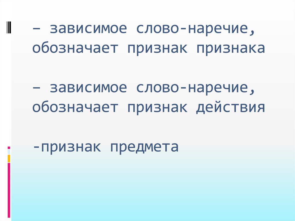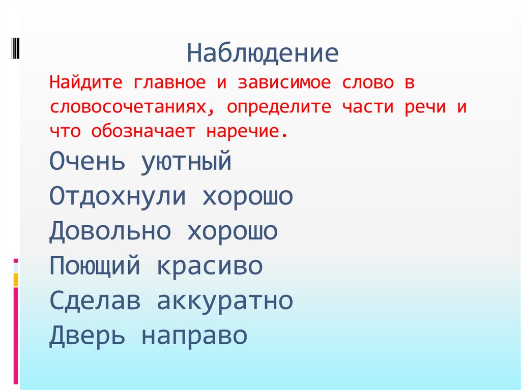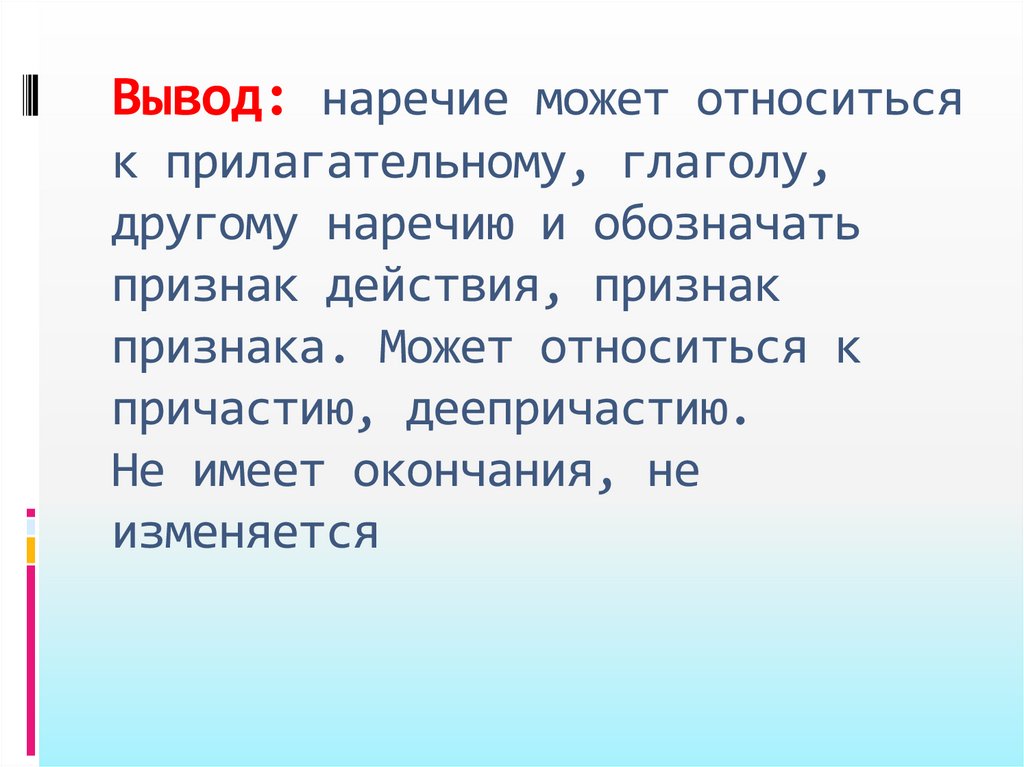 Вывод: наречие может относитьсяк прилагательному, глаголу,
