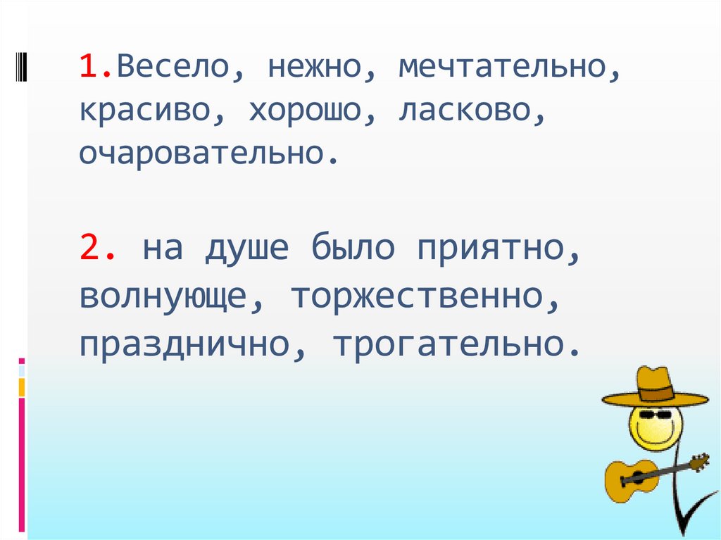 1.Весело, нежно, мечтательно,красиво, хорошо, ласково,