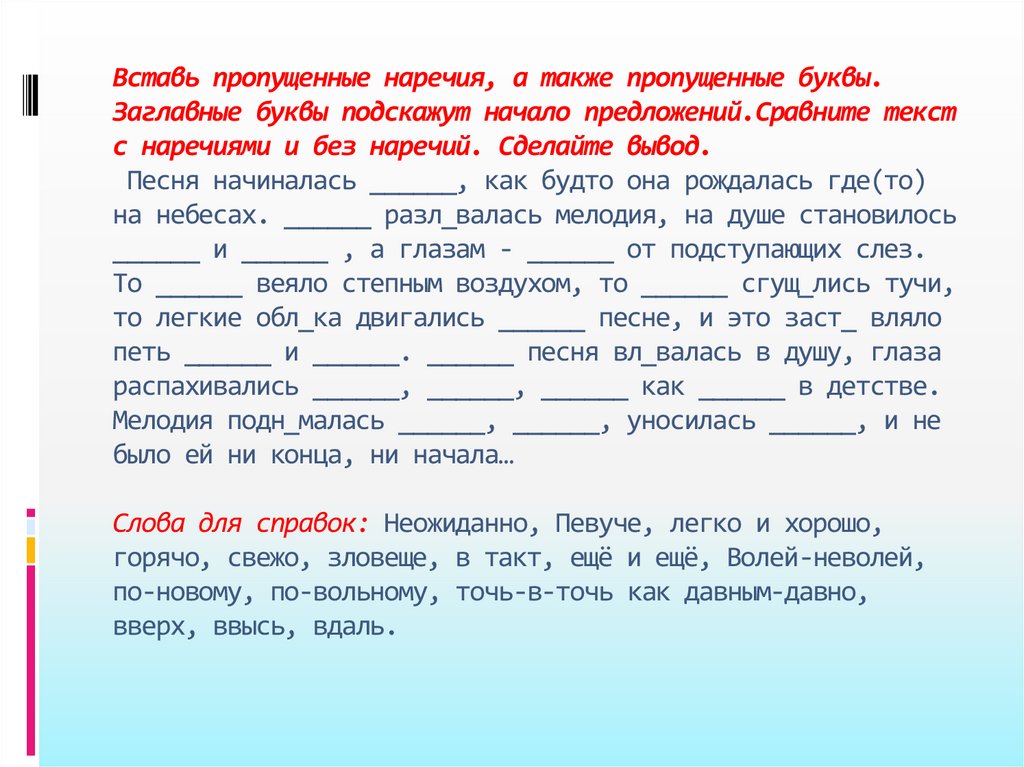 Вставь пропущенные наречия, а также пропущенные буквы.Заглавные буквы подскажут начало предложений.Сравните текст