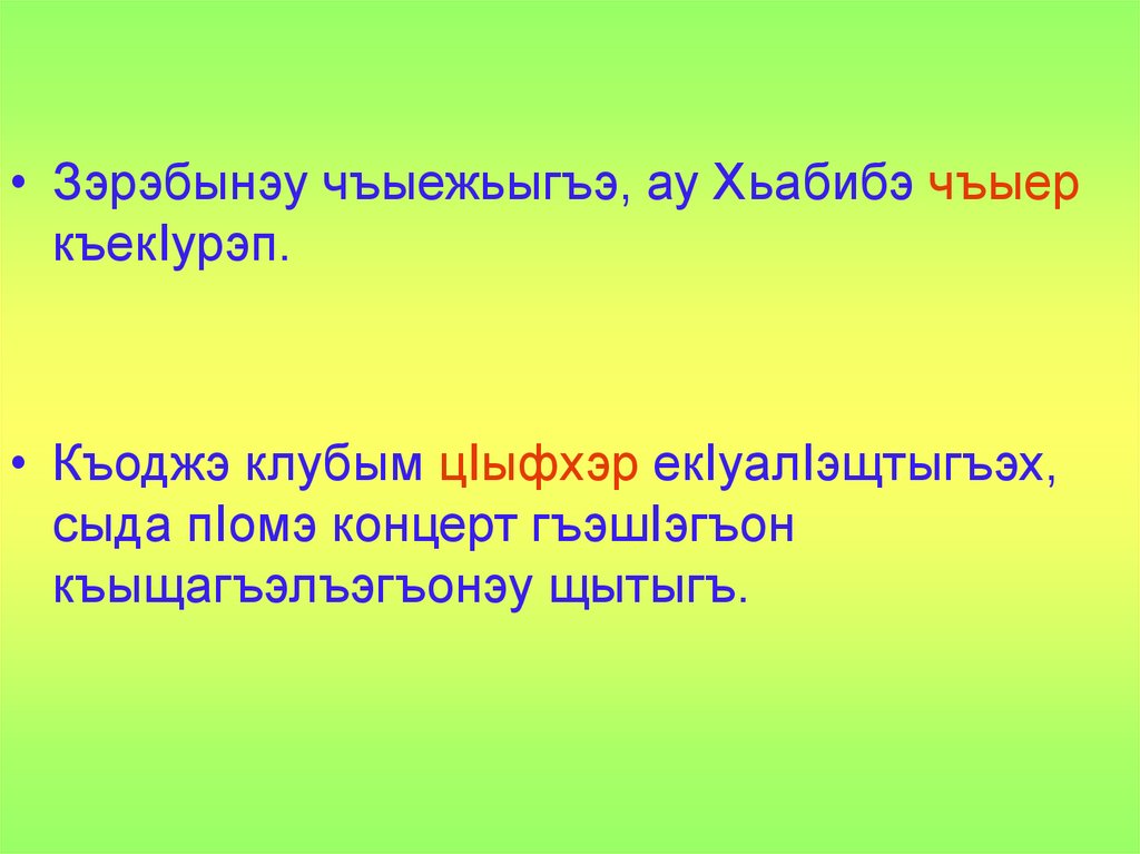 • Зэрэбынэу чъыежьыгъэ, ау Хьабибэ чъыеркъекIурэп.
