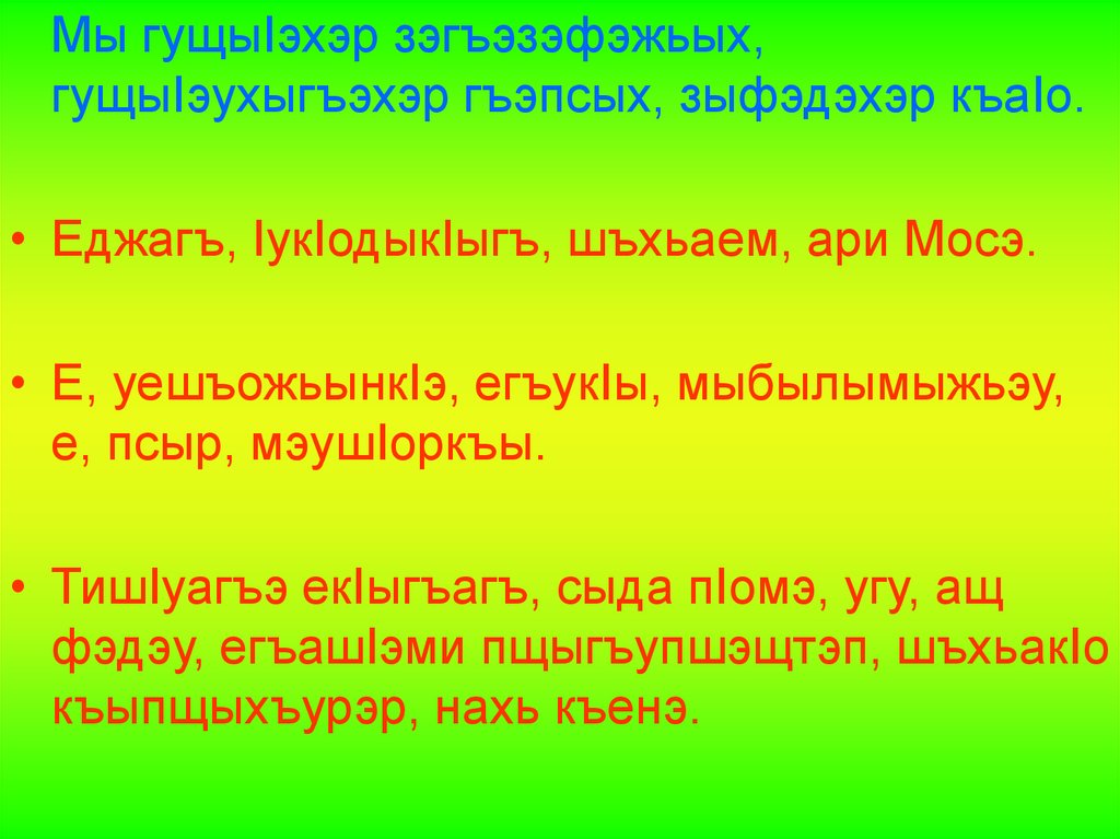 • Еджагъ, IукIодыкIыгъ, шъхьаем, ари Мосэ.