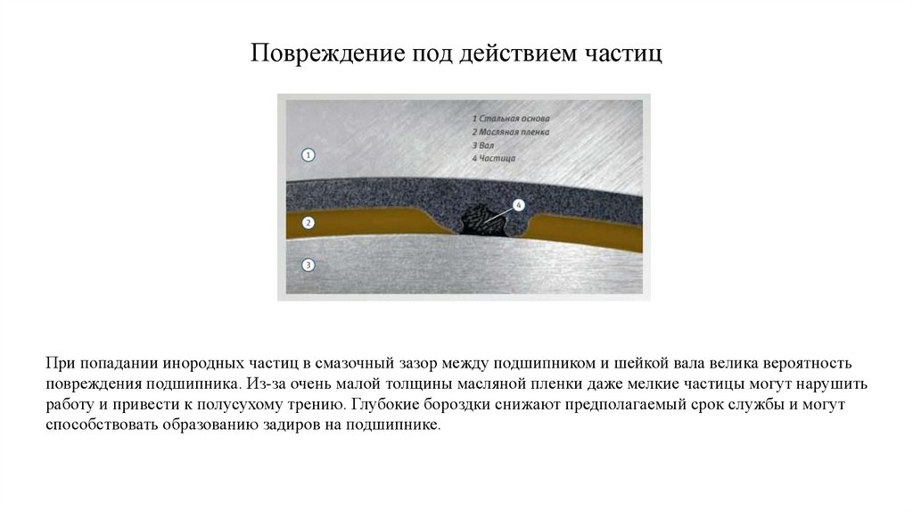 Повреждение под действием частицПри попадании инородных частиц в смазочный зазор между подшипником и шейкой вала велика вероятность