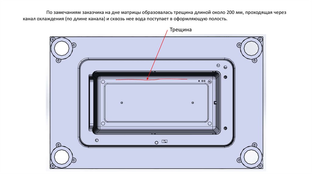 По замечаниям заказчика на дне матрицы образовалась трещина длиной около 200 мм, проходящая черезканал охлаждения (по длине канала) и сквозь нее вода поступает в оформляющую полость.